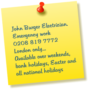 24 HOUR EMERGENCY SERVICES Emergency work over the festive period covering the City, North, East, & Central London, extending beyond the M25. 7 days per week and 24Hrs per day. Call John on 0208 819 7772 Electrical Services 24 HR Emergency Services, Design & Installation, Testing & Certification About us Competitive rates, with over 30 years experience. Specialising in solving emergency electrical problems quickly. Please feel free to call at any time. We operate a 24 hours service over Christmas and the New Year. “North, East & Central London. Call Now on 0208 819 7772 Your local Electrician. Open for business 7 days a week, 365 days a year  © thewireman.co.uk. All rights reserved. Email: johnburger@iname.com TM